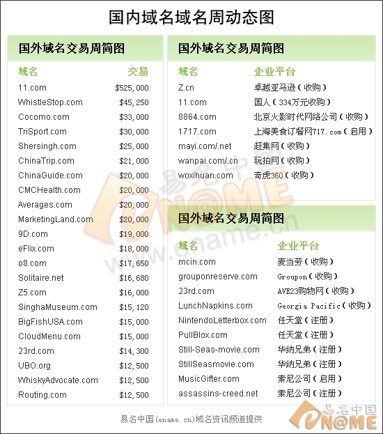 26個(gè)CN短域名價(jià)值高昂毋庸質(zhì)疑,本周卓越亞馬遜啟動(dòng)CN短域名z.cn更是令CN短域名大火一把,如此珍貴域名相必費(fèi)資不少吧!另外,國(guó)人從海外低調(diào)收購(gòu)了2數(shù)字.com域名11.com交易案例也是傳得火熱,11.com域名價(jià)值334萬(wàn)元呀,國(guó)內(nèi)買家手筆!本周,還有兩個(gè)數(shù)字域名交易和啟用,北京火影時(shí)代網(wǎng)絡(luò)公司買下帶“88”數(shù)字域名8864.com,上海美食訂餐網(wǎng)717.com啟用早前交易的數(shù)字域名1717.com。另外,拼音域名行業(yè)也不錯(cuò),趕集網(wǎng)收購(gòu)“螞蟻”雙拼域名mayi.com/.net,玩拍網(wǎng)買域名wanpai.com/.cn,360公司購(gòu)我喜歡三拼域名woxihuan.com。